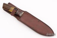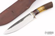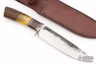 This Camp Knife by Mike Malosh features a satin finished hollow ground blade with forge finished flats, .214" blade stock and 1.655" blade depth, hidden tang construction. The handle has a copper guard, black/aluminum/copper spacers, stag grip. Includes a brown leather sheath. New from maker at the 2024 Blade Show.