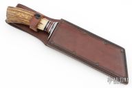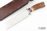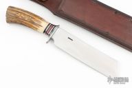 This Camp Knife by Mike Malosh features a satin finished convex ground blade with .221" blade stock and 1.735" blade depth, hidden tang construction. The handle has a stainless steel guard, black/red/aluminum spacers, stag grip. Includes a brown leather sheath. New from maker at the 2024 Blade Show.