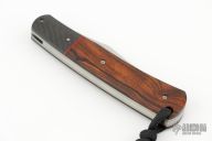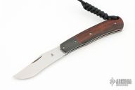 This Slim Line Trapper by Jason Clark features a hand rub satin finished blade with a nail nick. The handle has carbon fiber bolsters, desert ironwood covers, orange peel finished titanium liners, stainless steel backspacer. This is a double detent slip joint. Has half-stop. Comes with COA and a leather slip sheath. New from maker at the 2024 Blade Show.