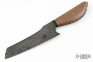Modified Santoku -- Pattern-welded 1084/15N20/nickel random pattern blade. Roll printed, die formed and patinated copper 'scales' attached to a G10 frame. The bolster is G10/nickel silver/G10. Dimensions are: 185mm blade, 300mm OAL and 44mm at the heel.  The handles start as sheet copper. They are either etched or roll printed to create a pattern. They are then die formed to create the shape and form a 'scale'. The scales are attached to a frame and fitted to the hidden tang with epoxy.  Includes a padded zippered case.  New from maker!