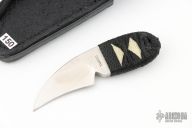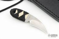 This Japanese Neck Claw by Mickey Yurco features a satin finished blade with notched thumbrest, .166" blade thickness and .970" blade depth, hidden tang construction. The handle has black cord wrap over white stingray skin. Comes with a hand tooled black leather neck sheath. New from maker at the 2024 Blade Show. #4617