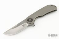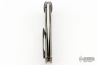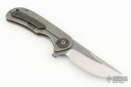 This King Fisher framelock flipper by Jared Price features a two-tone finished upswept blade with notched flipper. The handle has a tumbled and orange peel finished titanium frame with a lightning strike carbon fiber tip up clip and pivot collars. Rides on bearings, nice detent, lockup and blade seating. Excellent condition.
