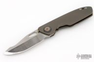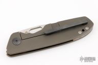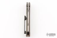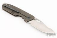 This Framelock by Collins Custom Knives features a satin finished blade with thumbhole. The handle has a blasted and anodized titanium frame, zirconium pivot on the lockside, and zirconium and super conductor pivot on the front, and tip up zirconium clip with hidden screws, super conductor backspacer. Has a few light scratches, otherwise excellent condition.