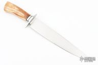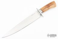 This Bowie by Journeyman Smith Dave Loukides features a hand rub satin finished blade with visible temper line, .187" blade stock and 1.810" blade depth, hidden tang construction. The handle has stainless steel guard, fossil walrus ivory grip with black and nickel silver spacers. Has a few light scratches, otherwise excellent condition. Comes with a zippered case.