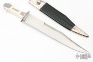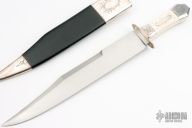 This Takedown Bowie by Judson Brennan and Sons features a hand rub satin finished blade with false top edge, .383" blade stock and 1.720" blade depth, hidden takedown tang construction. The blade has an engraved sterling silver guard, engraved silver bolsters and frame with mammoth ivory inlays and silver escutcheon. The spine of the blade is engraved with "J Brennan and Sons" and engraved under the ricasso with "No. 14". Comes with an engraved silver and black leather sheath with belt stud. Has a few light scratches, otherwise excellent condition. Comes with a zippered case.