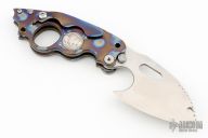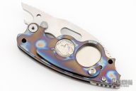 Has satin finished chisel ground drop point blade with fuller and thumbramp. Handle has hobo nickel inlay, flamed titanium frame. Flamed tip up clip. Comes with zipper case. Excellent condition.