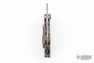 The VOW is a adjustable tension friction folder, also has the (H-F-L) Heeter fixed lock, so you can lock the folder in close position or open position. The frames also accept two standard size nickel coins. The customer can easily access the two screws that hold the coins in place from the inside of the frames. The VOW is also a cigar cutter, just make sure all your fingers are out of the way when you attempt to cut a cigar. On the open and closing action also customers need to be aware their fingers are out of the way of the cigar cutter opening. The VOW is also a bottle opener, only attempt this when the knife is fully closed and the HFL grenade pin is fully inserted. I am very excited about this model, the VOW has been on the design table for 3 years. I think this large friction folder definitely offers the most WOW factor you can buy in a knife. I also have other options coming soon in the near future for this knife.