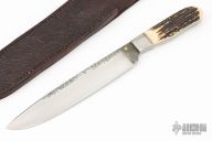 This Camp Knife from Master Smith Don Fogg features a hand rub satin finished blade with forge finish flats and a visible hamon, .178" blade stock and 1.295" blade depth, full tang construction. The handle has fluted steel bolsters with a thin copper inlay, stag scales with brass pins. Comes with a brown leather sheath and a zippered case. Has a couple of small spots on the blade, otherwise excellent condition.