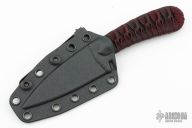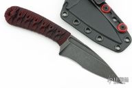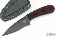 This SIN by Bastinelli Knives features a black finish recurve blade with notched thumbrest and fullers, .136" blade stock and 1.15" blade depth, full tang construction. The handle has a custom cord wrap over Stingray. Comes with kydex sheath and zippered case. New from maker!