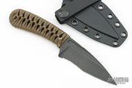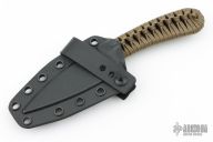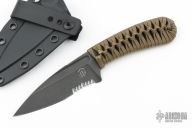 This SIN by Bastinelli Knives features a black finish recurve blade with notched thumbrest serrations, and fullers, .136" blade stock and 1.15" blade depth, full tang construction. The handle has a custom cord wrap over Stingray. Comes with kydex sheath and zippered case. New from maker!