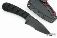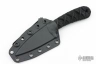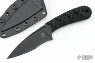 This SIN by Bastinelli Knives features a black finish recurve blade with notched thumbrest, and fullers, .136" blade stock and 1.15" blade depth, full tang construction. The handle has a custom cord wrap over Stingray. Comes with kydex sheath and zippered case. New from maker!