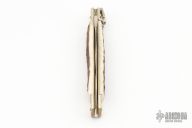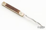 This leverlock auto by Hubertus features a mirror polished Kris style blade, edges are unsharpened, nickel silver double bolsters, stag scales, and brass liners and pins. Opens with a nice snap. Has some light scratches, otherwise excellent condition.