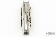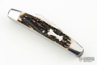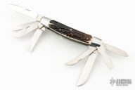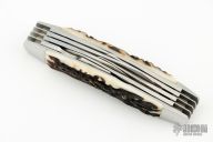 This 8-blade Congress Slipjoing by Eugene Shadley features hand rub satin finished blades with nail nicks. The handle has satin polished and pinched stainless steel double bolsters, stag covers with a stainless steel escutcheon, stainless steel liners and springs. #1361 on the blade. Excellent condition.