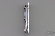 This XM-18 Slicer by Rick Hinderer Knives features a 3.5" stonewashed blade, notched thumbrest and dual thumbstuds. The handle has a white G-10 scale, and a stonewashed blue/purple titanium handle/clip. Clip can be mounted for tip up or down carry. Tri-way pivot system. Brass Hardware. Nice lockup, and detent. Includes the original box, extra hardware. New condition.