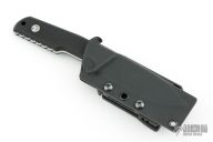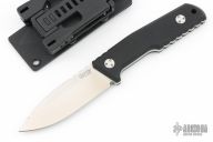 This Urban Tactical Fixed Blade from TRC Knives features a two tone blade with tumbled flats and satin grinds. The Blade has a notched thumb rest with 0.145" blade stock and 1.102" blade depth. The handle is comprised of textured black Peel-Ply G10 over full tang construction. Lanyard hole in pommel. Includes kydex sheath with Tek-Lok. Excellent condition.