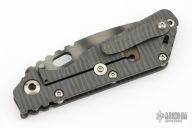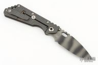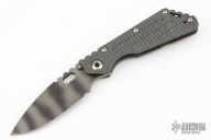 This Mick Strider Performance Series SMF framelock folder features a black finished spear point blade with thumbhole and notched thumbrest. The handle has a flamed titanium frame with titanium clip, tip up carry. Jimping on blade spine. Includes Hinderer "Lock Bar Stabilizer" for maximum reverse lock retention. Nice detent, lockup and blade seating. Excellent condition. Comes with a Strider patch.