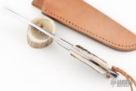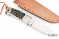 This Integral Drop Point Hunter by Patrick Teyke features a drop point hand rub satin finished blade, .155" blade stock at the ricasso and 1.171" blade depth, integral construction with tapered tang. The handle has stag scales with black liners/spacers lanyard hole at the butt. Comes with a brown leather sheath and a zippered case. Excellent condition.