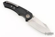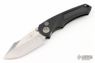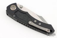 This D/A Pariah Auto by Heretic Knives features a stonewashed blade with notched thumbrest and dual thumbstuds. The handle has a black aluminum frame with non-slip inserts, flamed titanium pivot collars and a tip up clip with ceramic ball. Comes with original box and drawstring pouch. S/N 00088. Dated 12/2021. The knife can be shaken open, the detent ball is pushed too far into the liner, and needs repair. Otherwise, excellent condition.