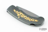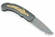 This lockback by Fred Carter features a mirror polished and blued blade. The handle has a blued steel frame with 24k gold inlays that are engraved, blued steel backspacer. Comes with a felt pouch. Has a couple very light scuffs, otherwise excellent condition.
