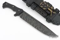 This Custom M-28 from Miller Bros. Blades features a clip point blade with fullers and notched thumbrest, false top edge, .322" blade stock and 2.270" blade depth, full tang construction. The handle is comprised of carved black G-10 scales, textured tang. Lanyard hole on pommel. Includes kydex and black leather sheath with belt loop. New from maker at the 2024 Blade Show.