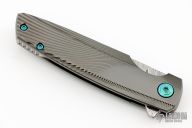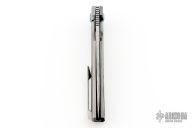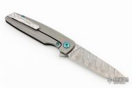 This Specter by Holt Bladeworks features a Dense Twist Damasteel blade with a notched thumbrest and flipper tab. The handle features a milled and polished zirconium frame, Thor Damasteel backspacer and tip up pocket clip with hidden screws, anodized hardware. Nice detent, lock up and blade seating. Includes the original zipper case, stickers, tool and COA #478. Excellent condition.