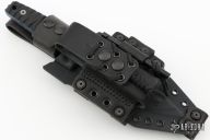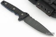 This Custom M-15 by Miller Bros Blades features a drop point blade with swedge, notched thumbrest made from Z-Wear PM steel, .322" blade stock 1.653" blade depth, full tang construction. The handle has textured black G-10 scales with blue G-10 liners, notched tang, lanyard hole at the butt. Comes with a kydex/leather sheath. New from maker at the 2024 Blade Show.