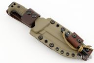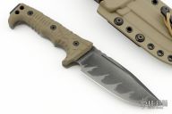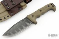 This Custom M-8 Compact by Miller Bros Blades features a clip point blade with notched thumbrest made from Z-Wear PM steel, .278" blade stock 1.662" blade depth, full tang construction. The handle has green G-10 scales with notched tang top and bottom. lanyard holes at the butt. Comes with a kydex/leather sheath. New from maker at the 2024 Blade Show.