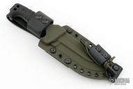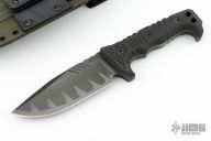 This Custom M-8 Compact by Miller Bros Blades features a clip point blade with notched thumbrest made from Z-Wear PM steel, .278" blade stock 1.662" blade depth, full tang construction. The handle has black G-10 scales with notched tang top and bottom. lanyard holes at the butt. Comes with a kydex/leather sheath. New from maker at the 2024 Blade Show.