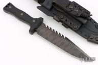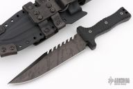 This Custom M-22 by Miller Bros Blades features a clip point blade with sharpened top edge and sawteeth on the spine made from Z-Wear PM steel, .321" blade stock 1.959" blade depth, full tang construction. The handle has black G-10 scales with lanyard holes at the butt. Comes with a kydex/leather sheath. New from maker at the 2024 Blade Show.