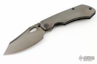 This Evolution 3.0 by Custom Knife Factory features a black satin finished blade with notched thumbrest and thumbhole. The handle has a black bark finished titanium frame with a matching tip up clip and backspacer. Comes with velcro case and COA. Nice detent, lockup and blade seating. #618 and dated 10-22. Has a scuff on the clip, otherwise Excellent condition.