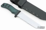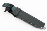 This Taiho2 by Mad Dog Knives features .252" stock, and 1.498" blade depth, hidden tang construction.  Hard chrome blade finish. The handle is designed to be ergonomic and has the ability to withstand tremendous punishment with little or no damage. It is hard and tough enough to be used as an impact tool. Black/green composite handle -- compression bonded to the hidden full tang and incredibly ergonomic. The knife comes with a kydex belt sheath. New from Maker!