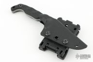 This Mini by Stroup Knives features a tumbled clip point blade with sculpted flats and a full tang construction.  .179" Blade Stock.  1.070" Blade Depth.  The handle features sculpted G10 scales.  Includes a kydex sheath with a Tek-Lok and the original box.  New from Maker!
