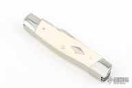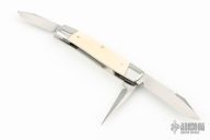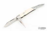 This Stockman slipjoint by Tom Ploppert features hand rub satin finished blades with nail nicks. The handle has stainless steel bolsters with integral liners, mammoth ivory covers and stainless steel escutcheon, stainless steel springs. Has half-stops, flush in all positions. Comes with zippered case. Excellent condition.