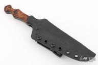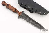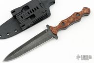 This Dagger by Stroup Knives features a dark tumbled dagger style blade with sculpted flats and a full tang construction.  .193" Blade Stock.  1.163" Blade Depth.  The handle features sculpted wood scales.  Includes a kydex sheath with a Tek-Lok and the original box.  New from Maker!