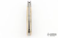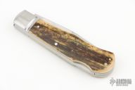 This Lockback by Jim Dunlap features a hand rub satin finished blade with nail nick. The handle has stainless steel fluted bolsters, mammoth ivory covers with stainless steel escutcheon, stainless steel liners and spring. Comes with a zippered case. Excellent condition.