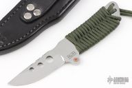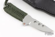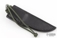 The Consolea Fighter is named after the Consolea or "Road Kill" Cactus.  Nicknamed the "Road Kill" Catcus since it is so thin, it looks like it was run over.  Great name for this slim fighter that hangs tight to the waist and low on the belt.  The blade is hand ground with custom hand made file cuts and has a decorative mosaic pin in the integrated finger guard.  The sheath is handmade leather and comes in Black or Tan with Black Edges.  The handle is Paracord woven through a cutout in the integrated tang.