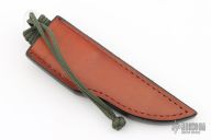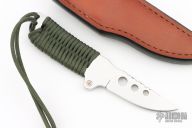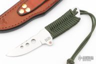 The Consolea Fighter is named after the Consolea or "Road Kill" Cactus.  Nicknamed the "Road Kill" Catcus since it is so thin, it looks like it was run over.  Great name for this slim fighter that hangs tight to the waist and low on the belt.  The blade is hand ground with custom hand made file cuts and has a decorative mosaic pin in the integrated finger guard.  The sheath is handmade leather and comes in Black or Tan with Black Edges.  The handle is Paracord woven through a cutout in the integrated tang.