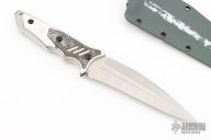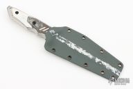 This Baby Shark by TASKnives features a satin finished spear point blade with a sharpened top edge, fuller, notched thumbrest, .187" blade stock and 1.463" blade depth, full tang construction. The handle has anodized titanium over ePAHT painted resin scales with black hardware. Comes with a black Kydex sheath. 61-62HRC. New from maker at the 2024 Blade Show!