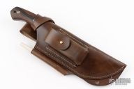 This WSK by Juergen Schanz features a satin finished blade with sawteeth on blade spine, full tang construction with .232" blade stock and 2.528" blade depth. The handle has zircote wood scales with a lanyard hole at the butt. Includes a brown leather sheath with belt loop and sharpening rod. New from maker at the 2024 Blade Show.
