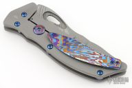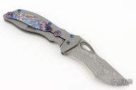 This knife by Juergen Schanz features a Damascus blade with thumbhole. The handle has a bead blasted titanium frame with timascus overlay and tip up clip, anodized titanium hardware, timascus barrel spacers. Nice detent, lockup and blade seating. Comes with a zippered case. New from maker at the 2024 Blade Show.