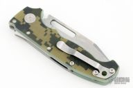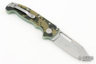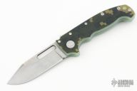 This AD20 by Demko Knives features a stonewashed clip point blade with notched thumbrest. The handle has a G-10 frame with a tip up stainless steel clip and "Shark" lock release on the spine. Comes with original box. New From Maker!