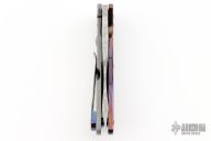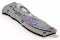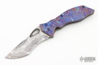 This knife by Juergen Schanz features a Damascus blade with thumbhole. The handle has a Timascus and bead blasted titanium frame with timascus tip up clip, anodized titanium hardware, timascus barrel spacers. Nice detent, lockup and blade seating. Comes with a zippered case. New from maker at the 2024 Blade Show.