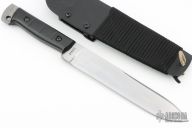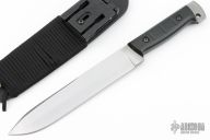 This knife by Bill Siegle features a satin finished blade with false top edge, .246" blade stock and 1.368" blade depth, full tang construction. The handle has black canvas micarta scales. Comes with a kydex sheath. Has some light scratches and patina, otherwise good condition.