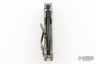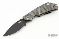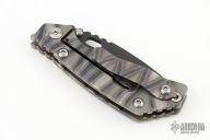 This PT framelock folder features a black drop point blade with thumbhole and notched thumbrest. The handle has a Disruptive Strider Striped titanium frame with titanium clip, tip up carry. Jimping on blade spine. The frame is from a PT persian. Nice detent, lockup and blade seating. New Condition.