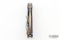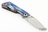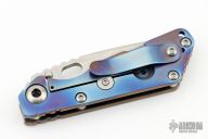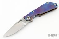 This JVA by Mick Strider is larger than a PT, but smaller than an SNG. It features a stonewashed blade with notched thumbrest and thumbhole. The handle has an anodized and orange peel finished titanium frame with matching tip up clip. New condition.