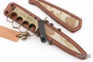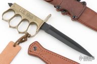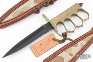 This Doughboy V2Trench Knife by Les George and Bawidamann Blades features a black Cerakote double edged blade with .188" blade stock, 1" blade depth, hidden tang construction. The handle has a cast brass knuckle guard grip with a skull crusher. Comes with a brown leather and M1942 Beach Frogskin Camo scabbard by Chattanooga Leatherworks. New condition. Comes with a matching MK1 MOD 2 SAP. Comes with zippered cases.