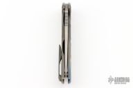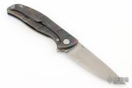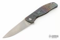 This F95T by Shirogorov Knives features a stonewashed/bead blast finish blade with a notched thumbrest and flipper. The handle has a darkened, subtle rainbow anodized titanium frame with satin finished post, and matching tip up clip. Nice detent, lockup and blade seating. Has MRBS. Has a couple light scuffs, excellent condition otherwise.