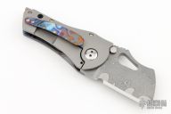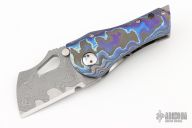 This custom framelock from Damjan Knives features a San-Mai Damascus blade with file worked blade spine, and thumbhole. The handle is crafted from a Zircuti scale, bead blast finished backspacer. The matching Zircuti pocket clip is positioned for tip up carry. Comes with zipper case. Blade is centered when closed and locks up with no play. This piece is in excellent condition and shows no signs of use or carry.