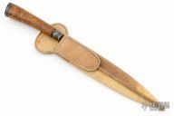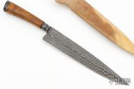 This knife by Maximiliano Pescie features a Feather Damascus blade with false top edge and an integral fluted guard, .191" blade stock and 1.409" blade depth, hidden tang construction with a fluted Feather Damascus butt, stabilized birch wood grip. Comes with a brown leather sheath and COA. New from maker at the 2024 Blade Show.