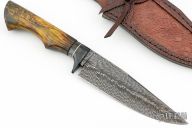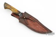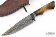 This knife by Maximiliano Pescie features a Feather Damascus blade with .248" blade stock and 1.462" blade depth, hidden tang construction. The handle has a blued 5160 steel guard with nickel silver spacer, Stabilized Birch wood grip. Comes with a brown leather sheath and COA. New from maker at the 2024 Blade Show.